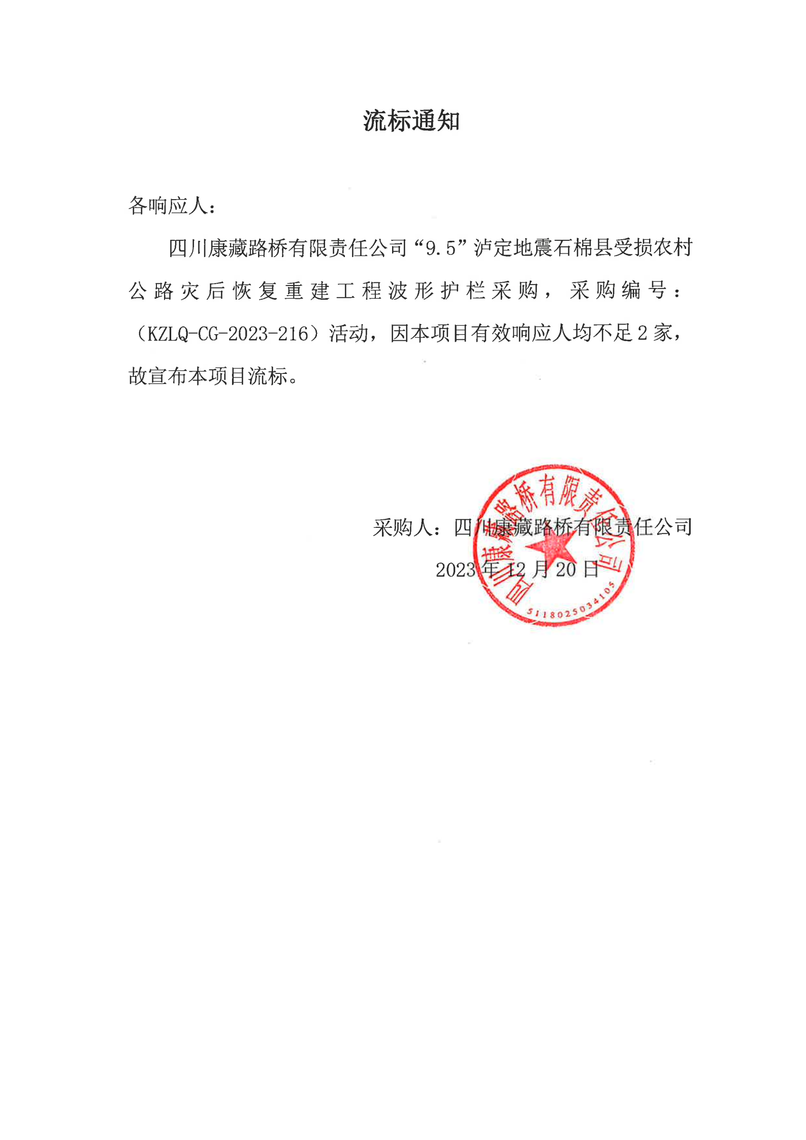 四川康藏路橋有限責任公司“9.5”瀘定地震石棉縣受損農(nóng)村公路災后恢復重建工程波形護欄采購流標通知