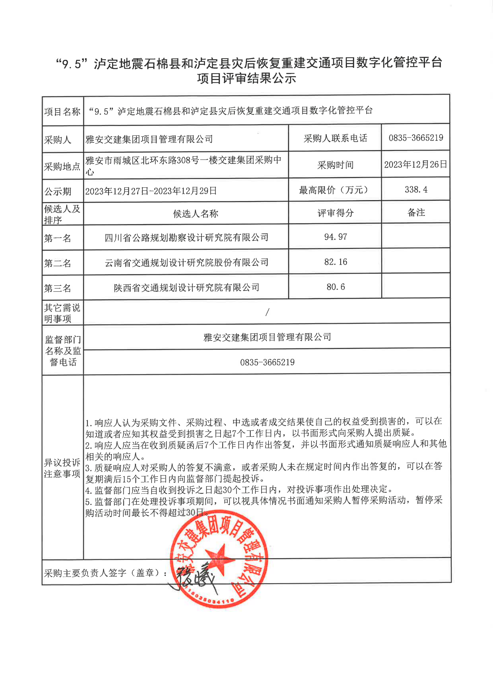 雅安交建集團(tuán)項目管理有限公司“9.5”瀘定地震石棉縣和瀘定縣災(zāi)后恢復(fù)重建交通項目數(shù)字化管控平臺項目評審結(jié)果公示