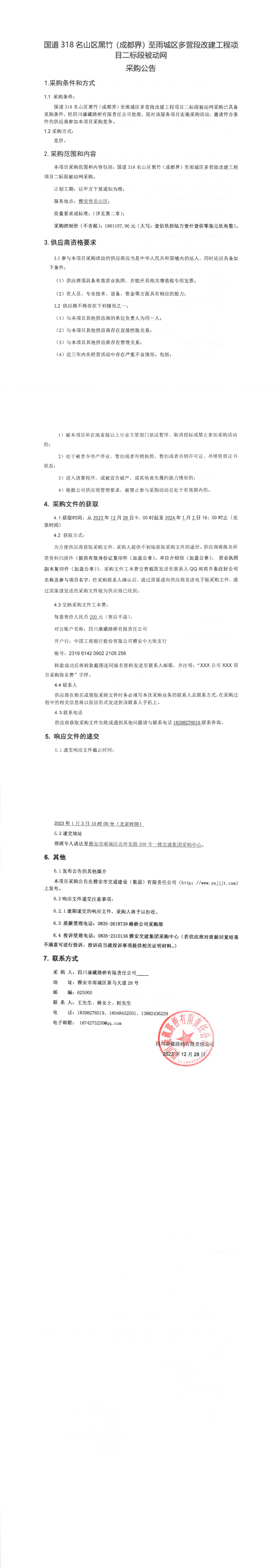 四川康藏路橋有限責任公司國道318名山區(qū)黑竹(成都界)至雨城區(qū)多營段改建工程項目二標段被動網采購公告