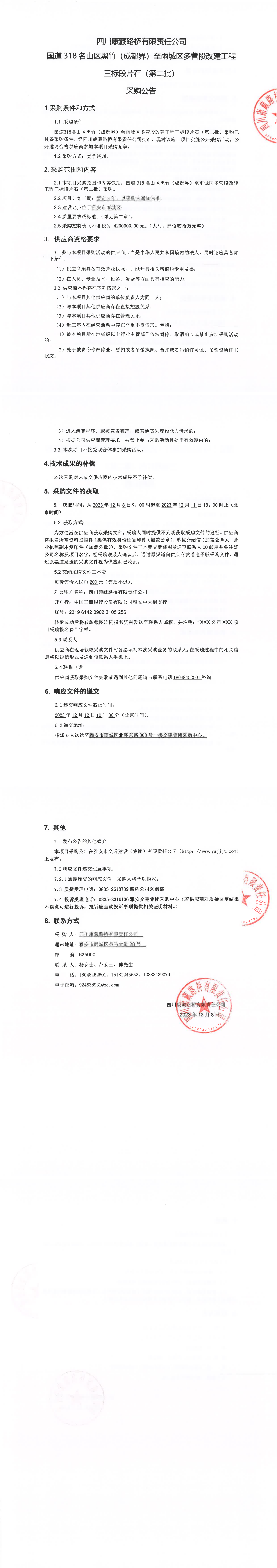 四川康藏路橋有限責任公司國道318名山區(qū)黑竹(成都界)至雨城區(qū)多營段改建工程三標段片石(第二批)采購公告