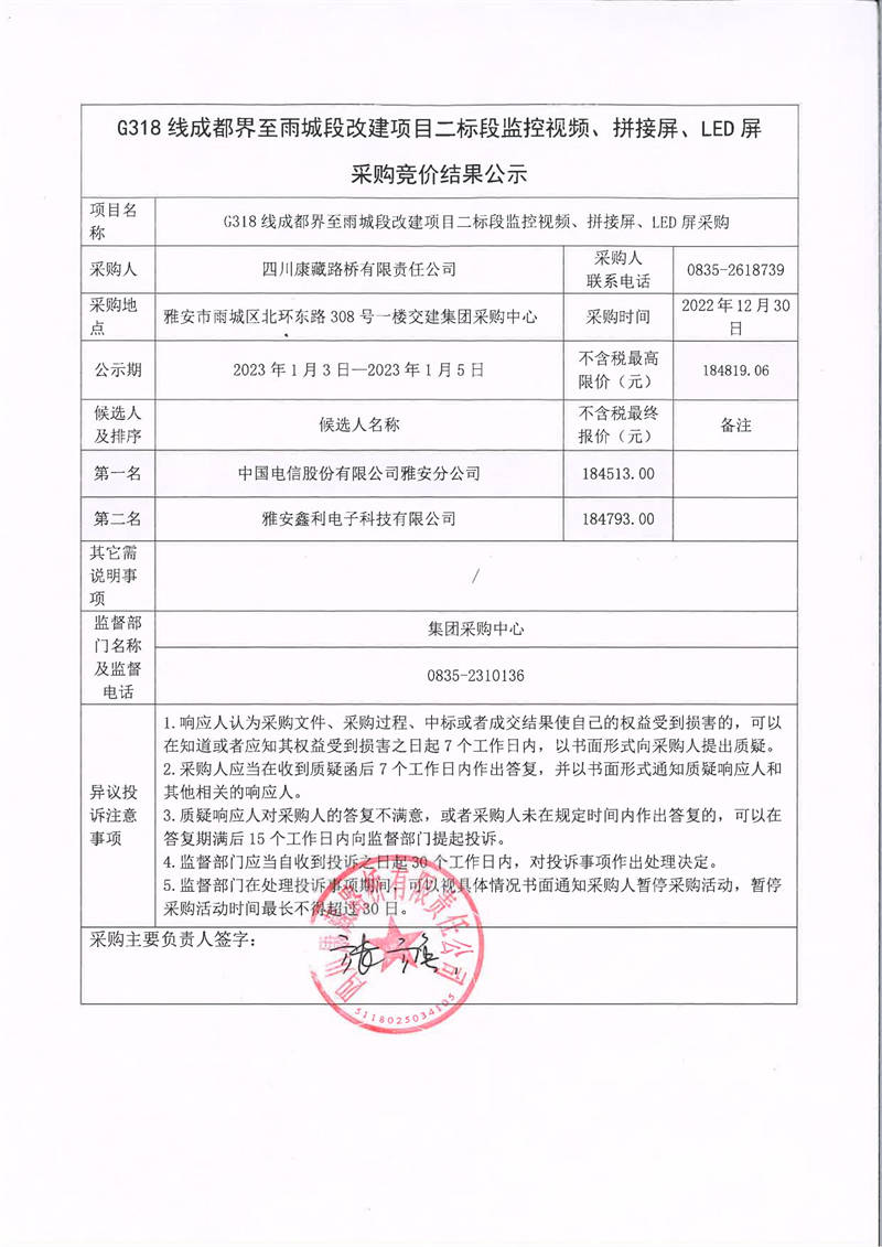 四川康藏路橋有限責(zé)任公司G318線成都界至雨城段改建項(xiàng)目二標(biāo)段監(jiān)控視頻、拼接屏、LED屏采購競(jìng)價(jià)結(jié)果公示