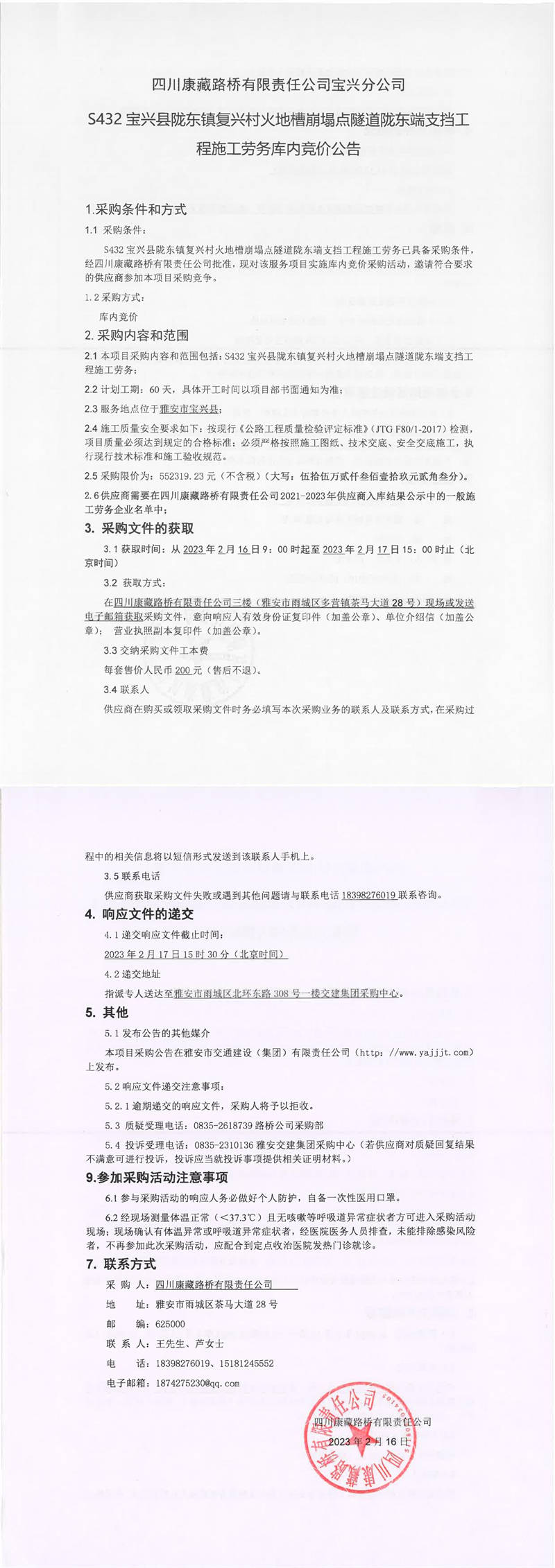 四川康藏路橋有限責(zé)任公司寶興分公司S432寶興縣隴東鎮(zhèn)復(fù)興村火地槽崩塌點隧道隴東端支擋工程施工勞務(wù)庫內(nèi)競價公告