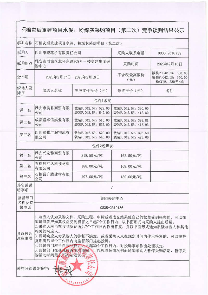 四川康藏路橋有限責(zé)任公司石棉災(zāi)后重建項(xiàng)目水泥、粉煤灰采購項(xiàng)目(第二次)競爭談判結(jié)果公示
