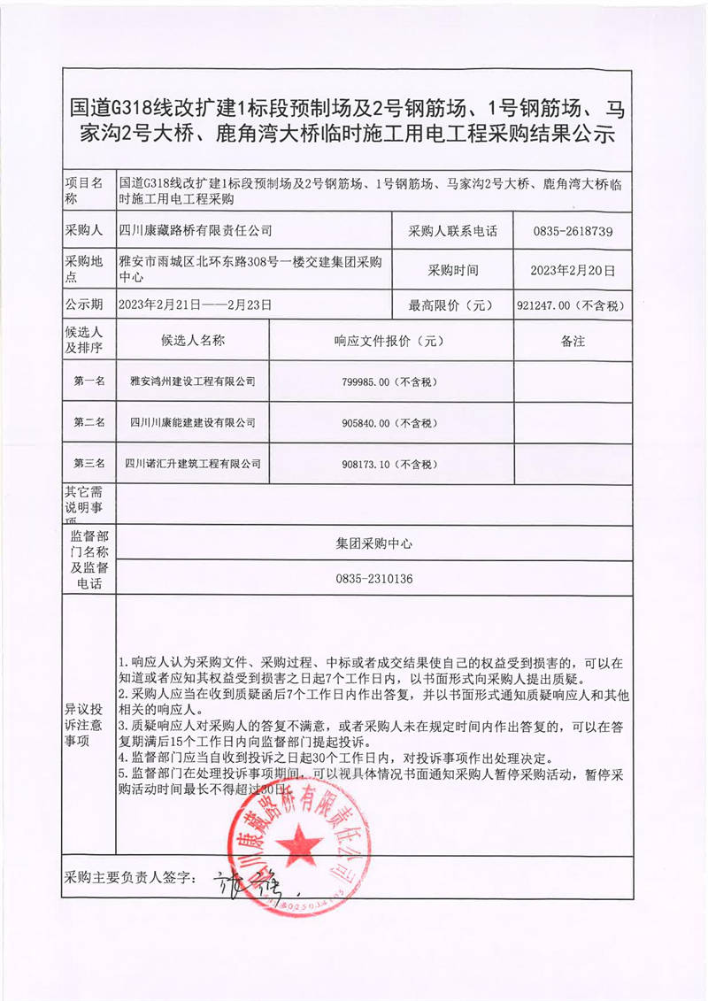 四川康藏路橋有限責(zé)任公司國(guó)道318線改擴(kuò)建1標(biāo)段預(yù)制場(chǎng)及2號(hào)鋼筋場(chǎng)、1號(hào)鋼筋場(chǎng)、馬家溝2號(hào)大橋、鹿角灣大橋臨時(shí)施工用電工程采購結(jié)果公示
