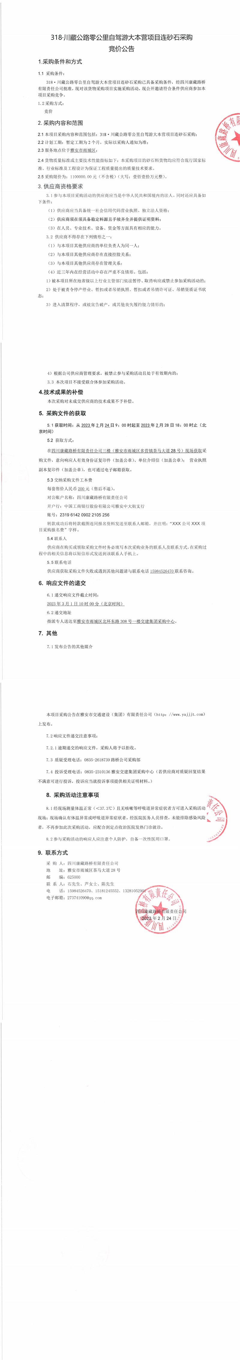四川康藏路橋有限責(zé)任公司318·川藏公路零公里自駕游大本營項目連砂石采購競價公告