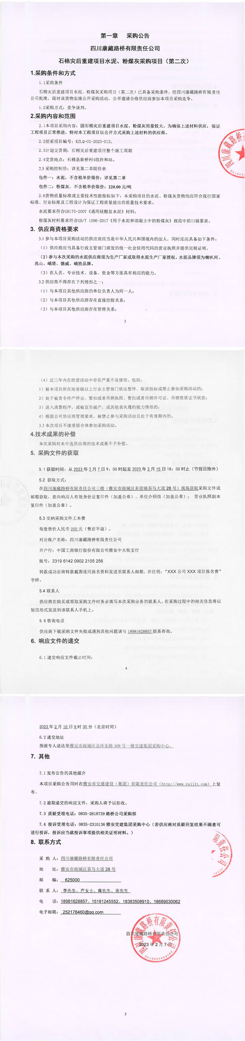 四川康藏路橋有限責(zé)任公司石棉災(zāi)重建項(xiàng)目水泥、粉煤灰采購(gòu)項(xiàng)目(第二次)采購(gòu)公告