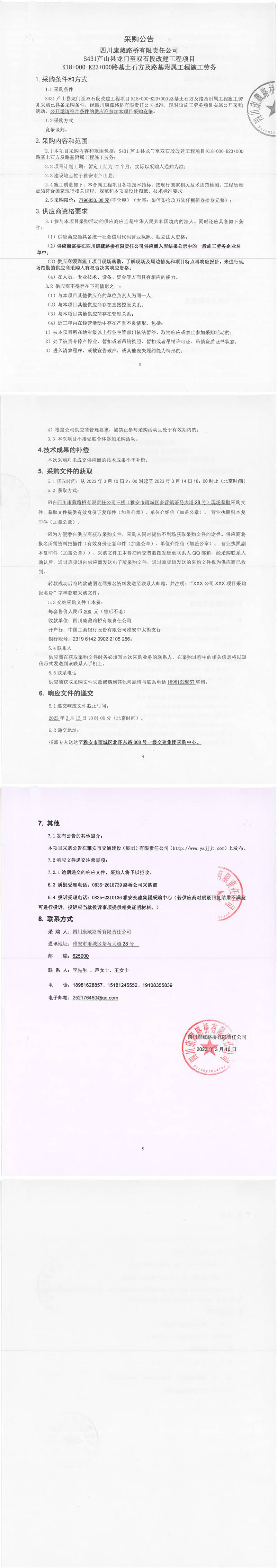四川康藏路橋有限責任公司S431蘆山縣龍門至雙石段改建工程項目K18+000-K23+000路基土石方及路基附屬工程施工勞務采購公告