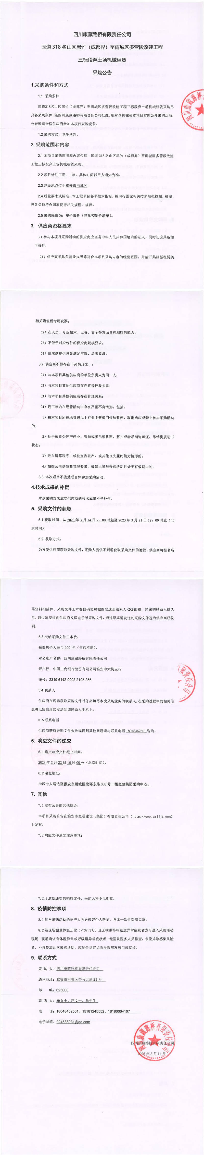四川康藏路橋有限責(zé)任公司國道318名山區(qū)黑竹(成都界)至雨城區(qū)多營段改建工程三標段棄土場機械租賃采購公告