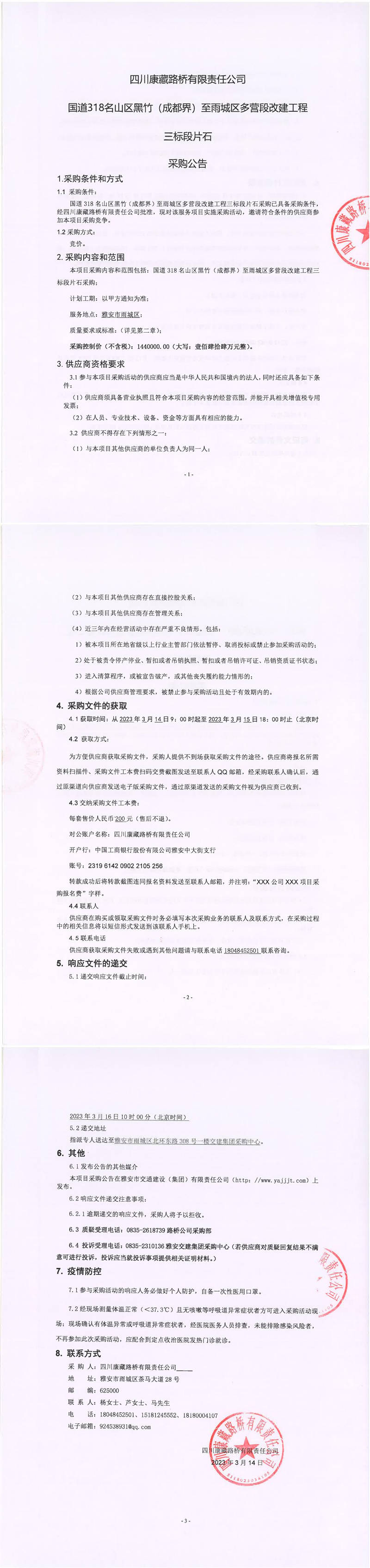 四川康藏路橋有限責(zé)任公司國(guó)道318名山區(qū)黑竹(成都界)至雨城區(qū)多營(yíng)段改建工程三標(biāo)段片石采購公告