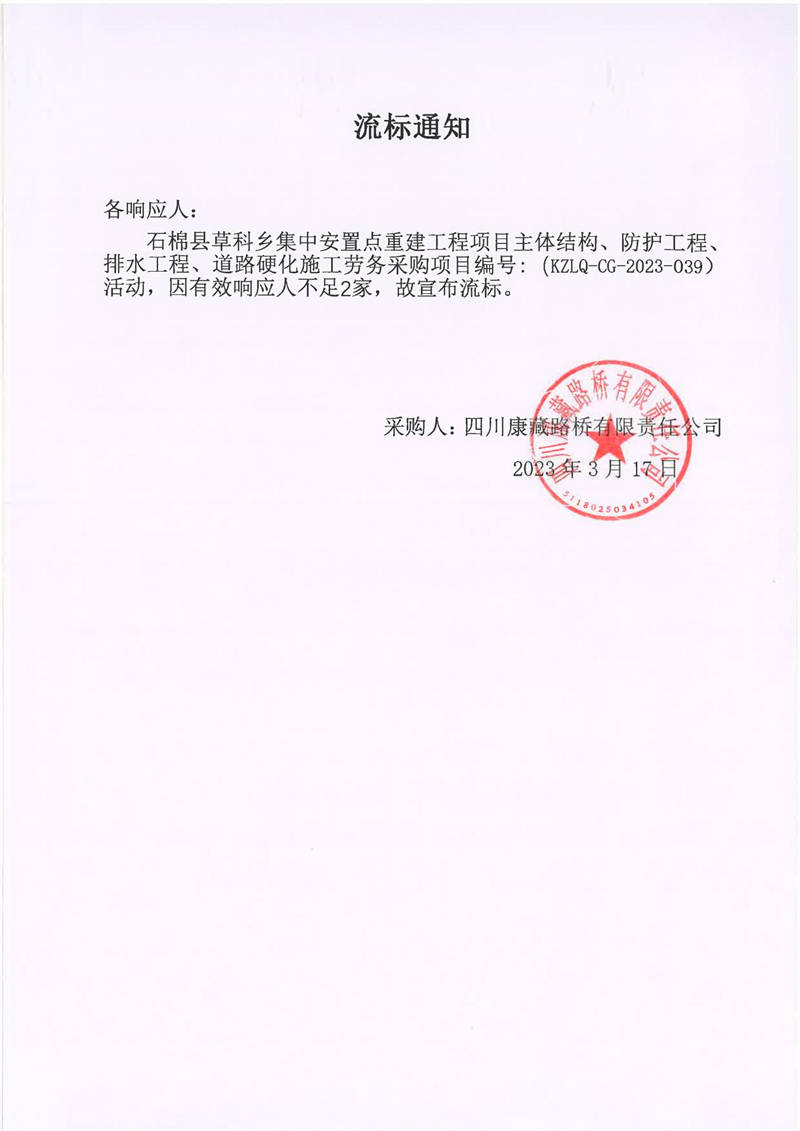 四川康藏路橋有限責(zé)任公司石棉草科鄉(xiāng)集中安置點(diǎn)重建工程項(xiàng)目主體結(jié)構(gòu)、防護(hù)工程、排水工程、道路硬化施工勞務(wù)采購(gòu)流標(biāo)通知