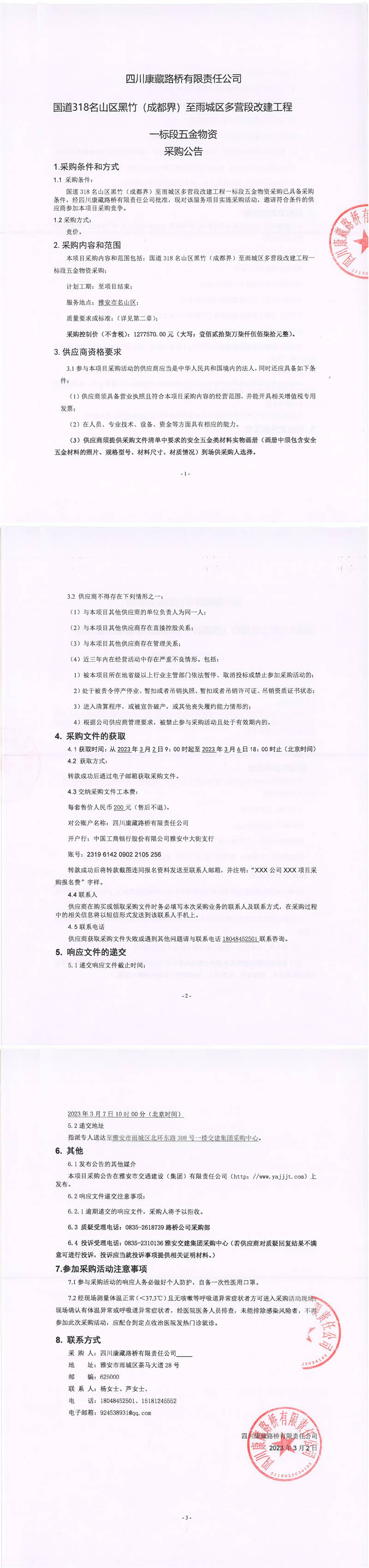 四川康藏路橋有限責任公司國道318名山區(qū)黑竹(成都界)至雨城區(qū)多營段改建工程一標段五金物資采購公告