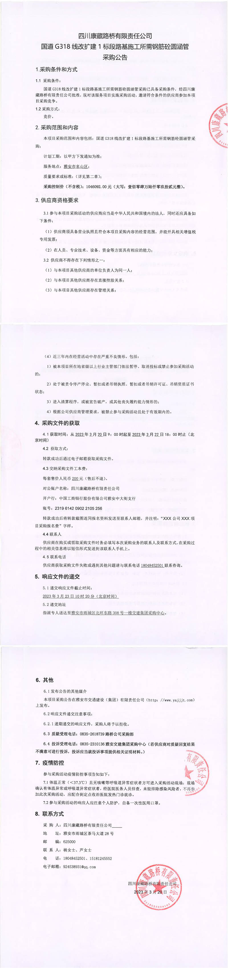 四川康藏路橋有限責(zé)任公司國道G318線改擴建1標(biāo)段路基施工所需鋼筋砼圓涵管采購公告