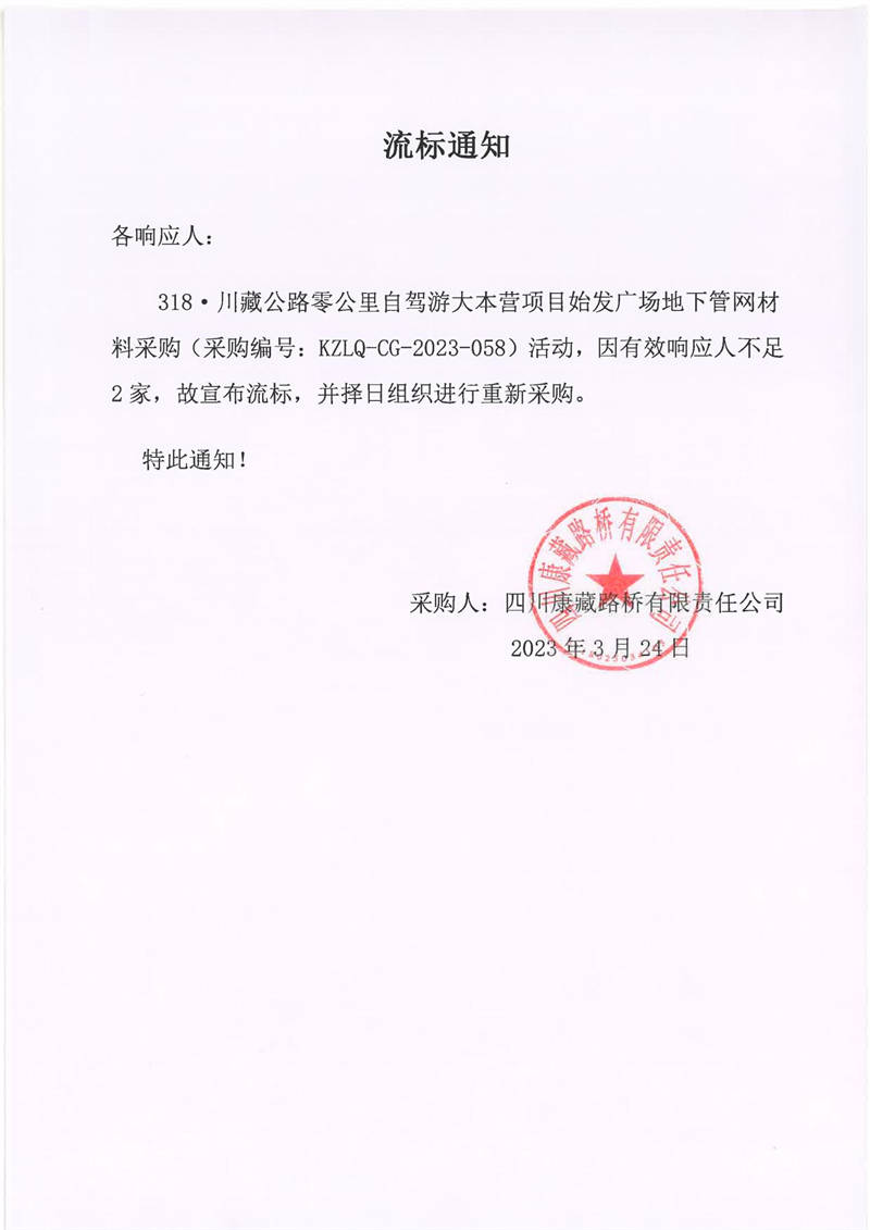 四川康藏路橋有限責(zé)任公司318·川藏公路零公里自駕游大本營項(xiàng)目始發(fā)廣場(chǎng)地下管網(wǎng)材料采購流標(biāo)通知