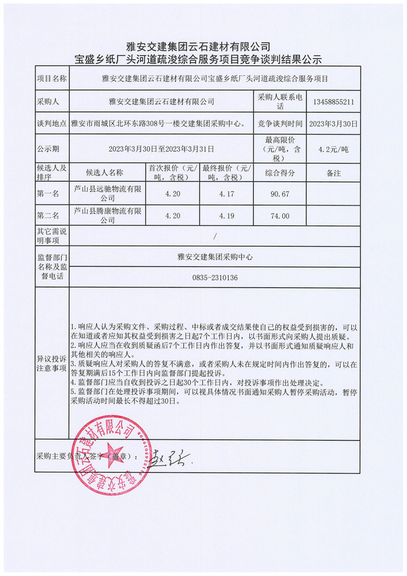 雅安交建集團云石建材有限公司寶盛鄉(xiāng)紙廠頭河道疏浚綜合服務(wù)項目競爭談判結(jié)果公示