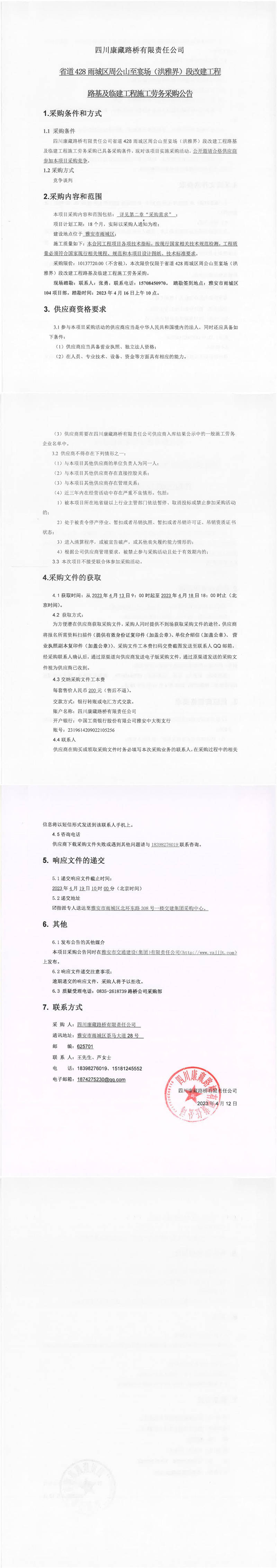 四川康藏路橋有限責(zé)任公司省道428雨城區(qū)周公山至宴場(洪雅界)段改建工程路基及臨建工程施工勞務(wù)采購公告