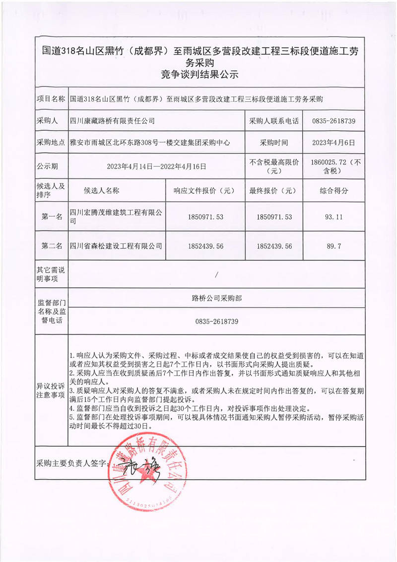四川康藏路橋有限責(zé)任公司國道318名山區(qū)黑竹(成都界)至雨城區(qū)多營段改建工程三標(biāo)段便道施工勞務(wù)采購結(jié)果公示