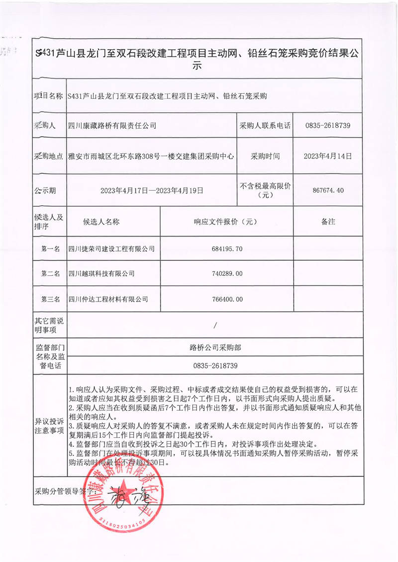 四川康藏路橋有限責任公司S431蘆山縣龍門至雙石段改建工程項目主動網(wǎng)、鉛絲石籠采購競價結果公示