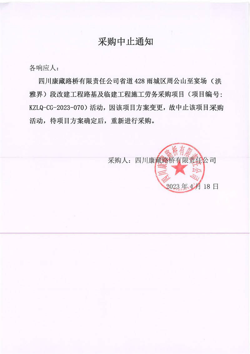 四川康藏路橋有限責(zé)任公司省道428雨城區(qū)周公山至宴場(洪雅界)段改建工程路基及臨建工程施工勞務(wù)采購項目采購中止通知