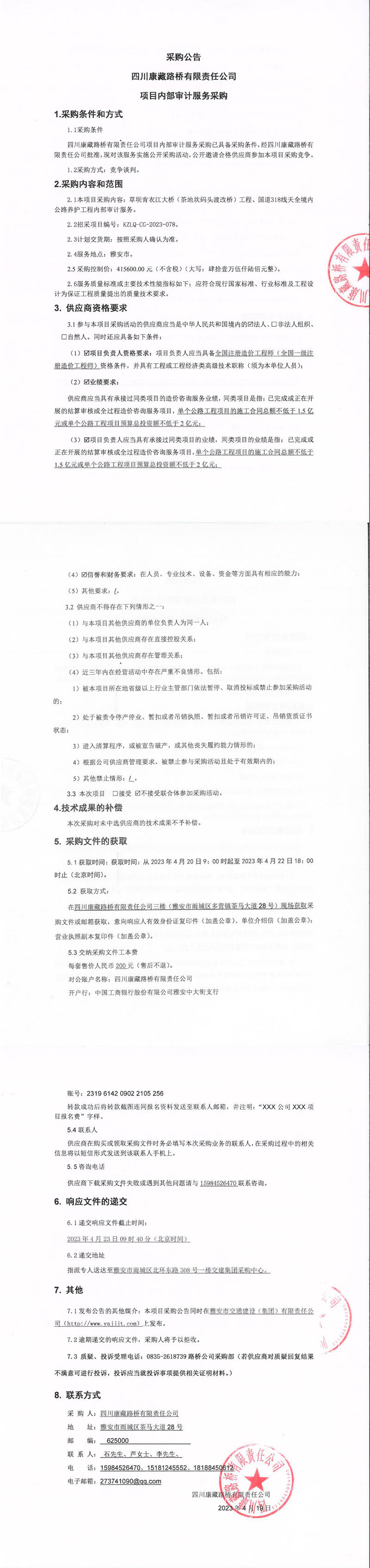 四川康藏路橋有限責任公司項目內(nèi)部審計服務(wù)采購公告