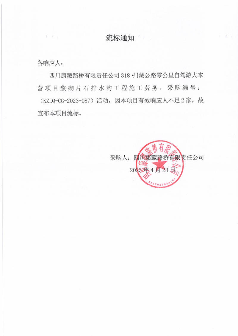 四川康藏路橋有限責(zé)任公司G318線成都至雨城段改建項(xiàng)目二標(biāo)段進(jìn)場便道(6#、7#、16#、18#)土石方及防護(hù)、排水工程施工勞務(wù)流標(biāo)通知