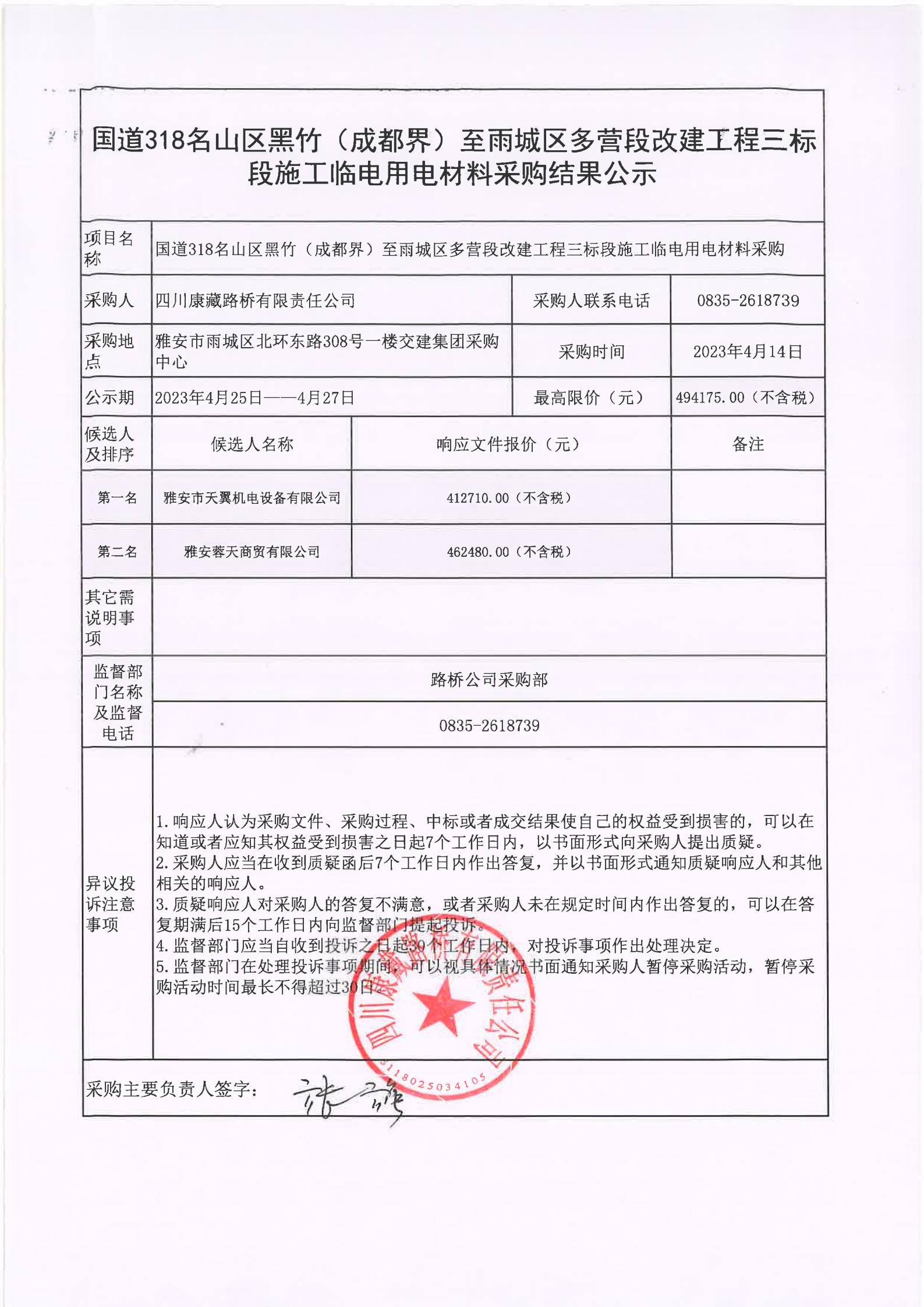 四川康藏路橋有限責任公司國道318名山區(qū)黑竹(成都界)至雨城區(qū)多營段改建工程三標段施工臨電用電材料采購結果公示