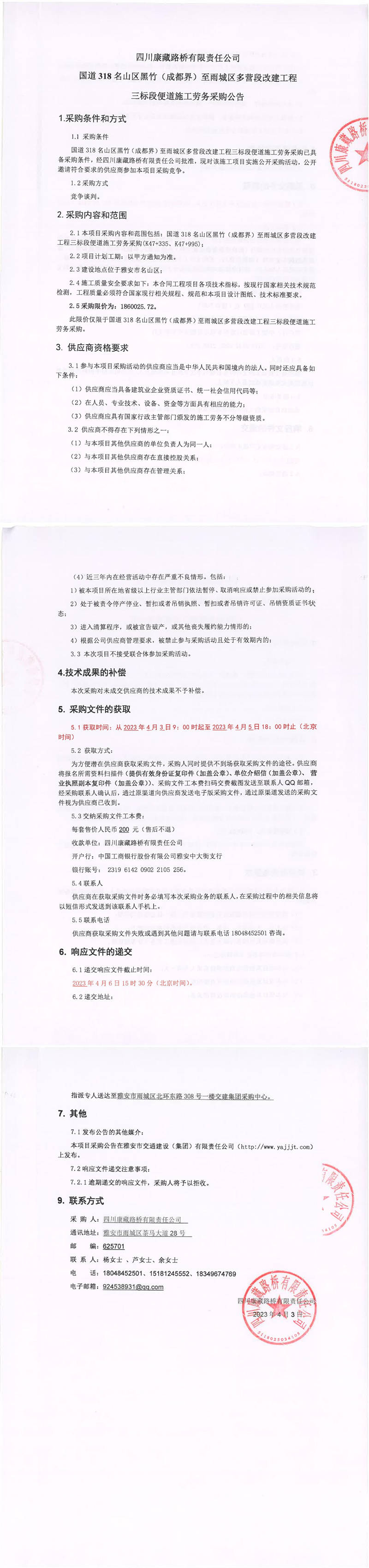 四川康藏路橋有限責(zé)任公司國道318名山區(qū)黑竹(成都界)至雨城區(qū)多營段改建工程三標(biāo)段橋梁施工勞務(wù)采購公告