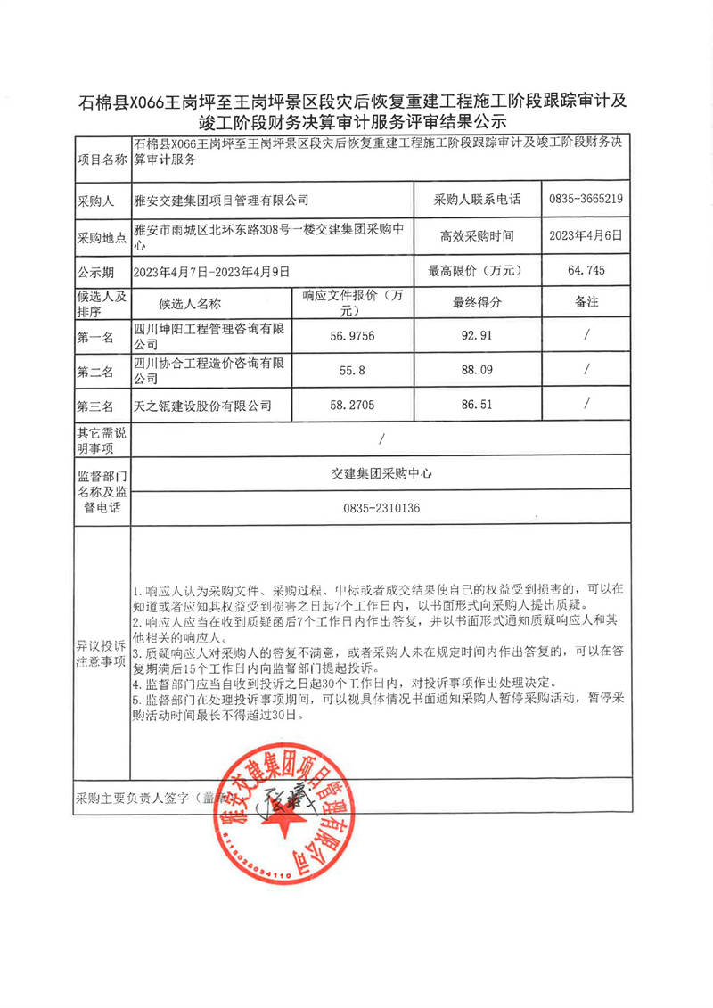 雅安交建集團(tuán)項目管理有限公司石棉縣X066王崗坪至王崗坪景區(qū)段災(zāi)后恢復(fù)重建工程施工階段跟蹤審計及竣工階段財務(wù)決算審計服務(wù)評審結(jié)果公示