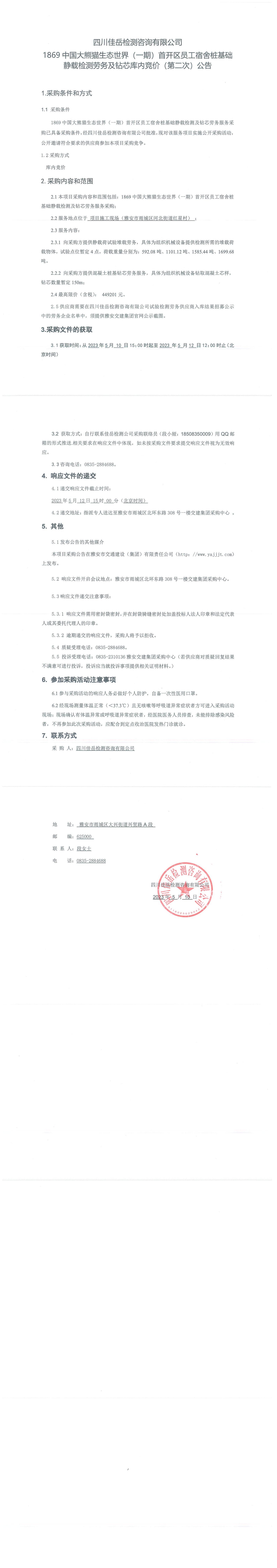 四川佳岳檢測咨詢有限公司1869中國大熊貓生態(tài)世界(一期)首開區(qū)員工宿舍樁基礎(chǔ)靜載檢測勞務(wù)及磚芯庫內(nèi)競價(第二次)采購公告