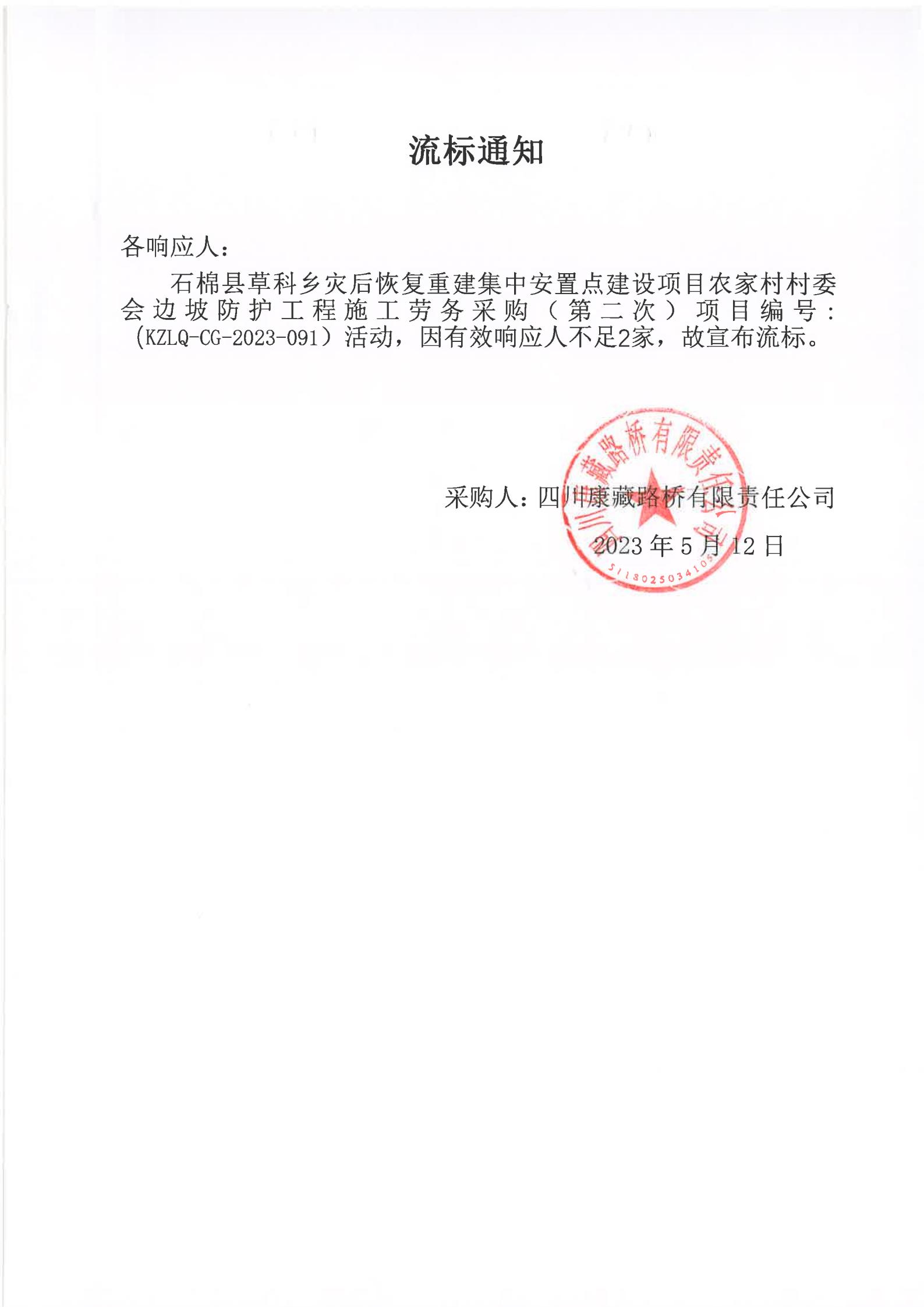 四川康藏路橋有限責任公司石棉草科鄉(xiāng)集中安置點建設項目農家村村委會邊坡防護工程施工勞務采購(第二次)流標通知