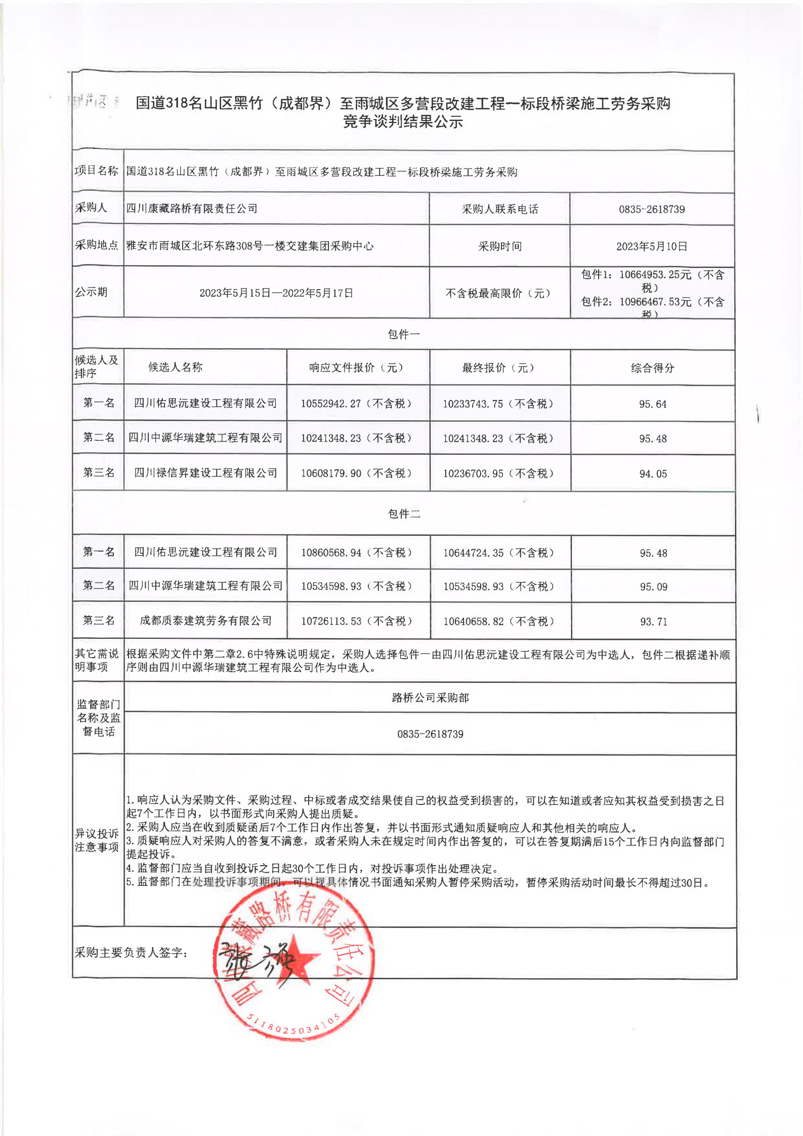 四川康藏路橋有限責(zé)任公司國道318名山區(qū)黑竹(成都界)雨城區(qū)多營段改建工程一標(biāo)段橋梁施工勞務(wù)采購競爭談判結(jié)果公示