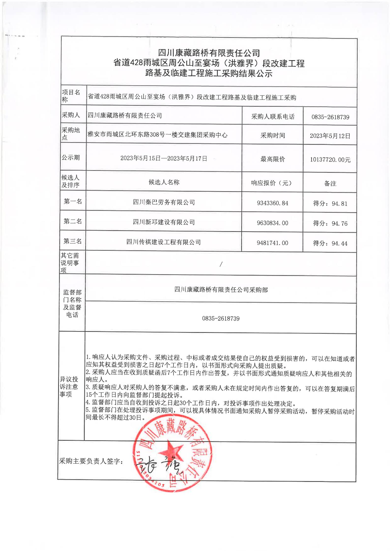 四川康藏路橋有限責(zé)任公司省道428雨城區(qū)周公山至宴場(chǎng)(洪雅界)段改建工程路基及臨建工程施工采購(gòu)結(jié)果公示