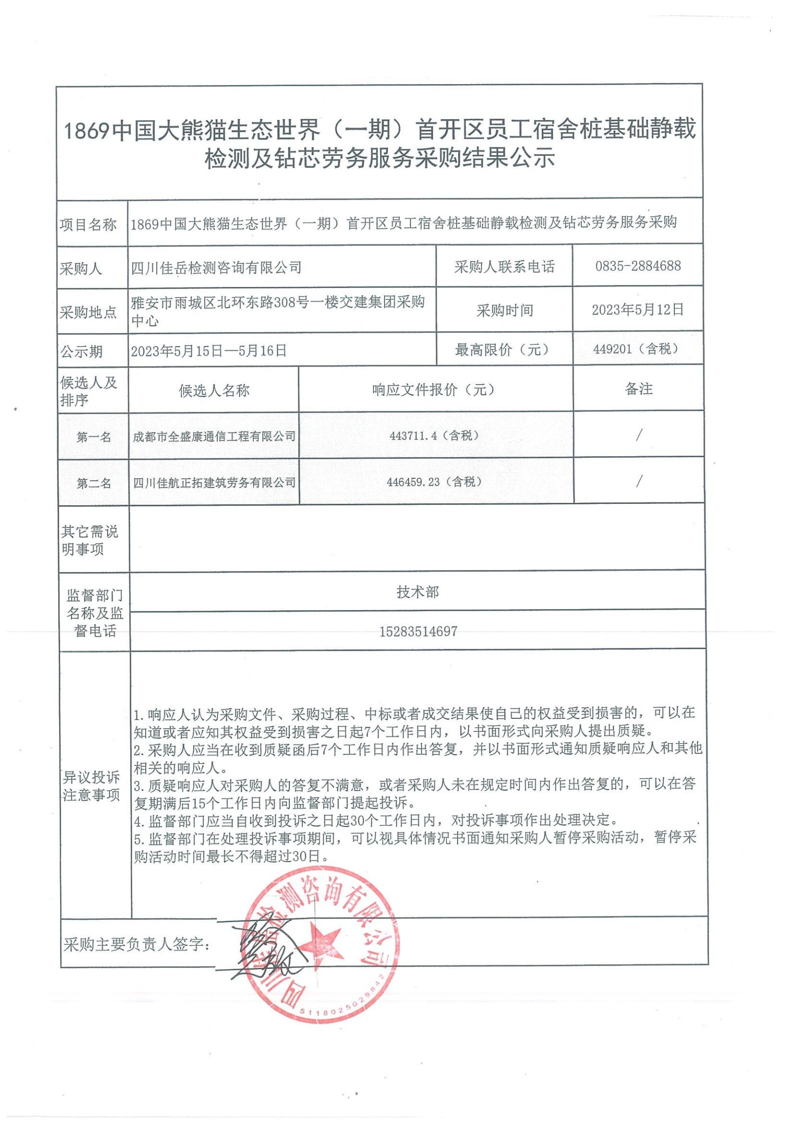 四川佳岳檢測咨詢有限公司關(guān)于1869中國大熊貓生態(tài)世界(一期)首開區(qū)員工宿舍樁基礎(chǔ)靜載檢測勞務及鉆芯項目中標結(jié)果公示