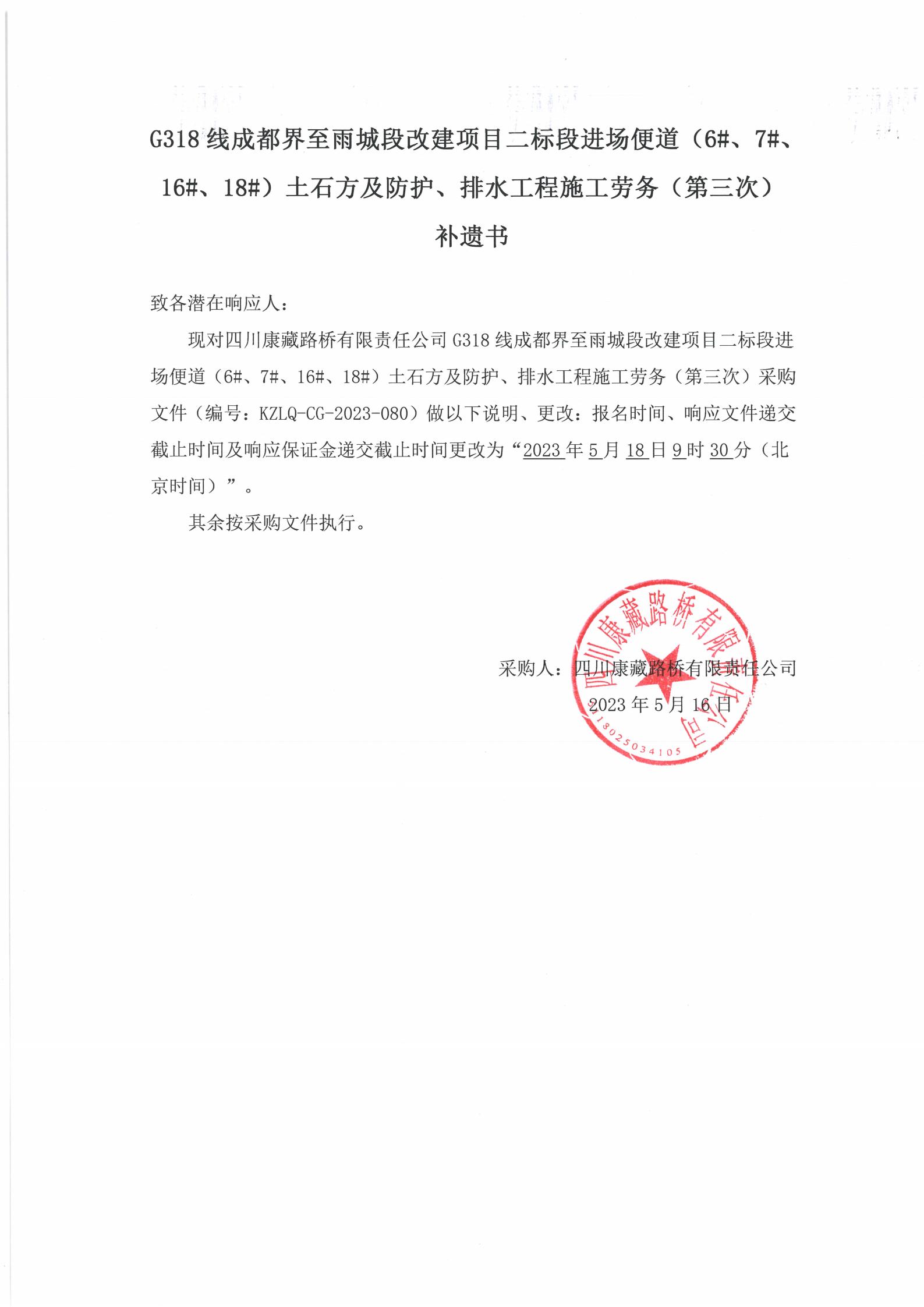四川康藏路橋有限責(zé)任公司G318線成都至雨城段改建項(xiàng)目二標(biāo)段進(jìn)場便道(6#、7#、16#、18#)土石方及防護(hù)、排水工程施工勞務(wù)(第三次)補(bǔ)遺書