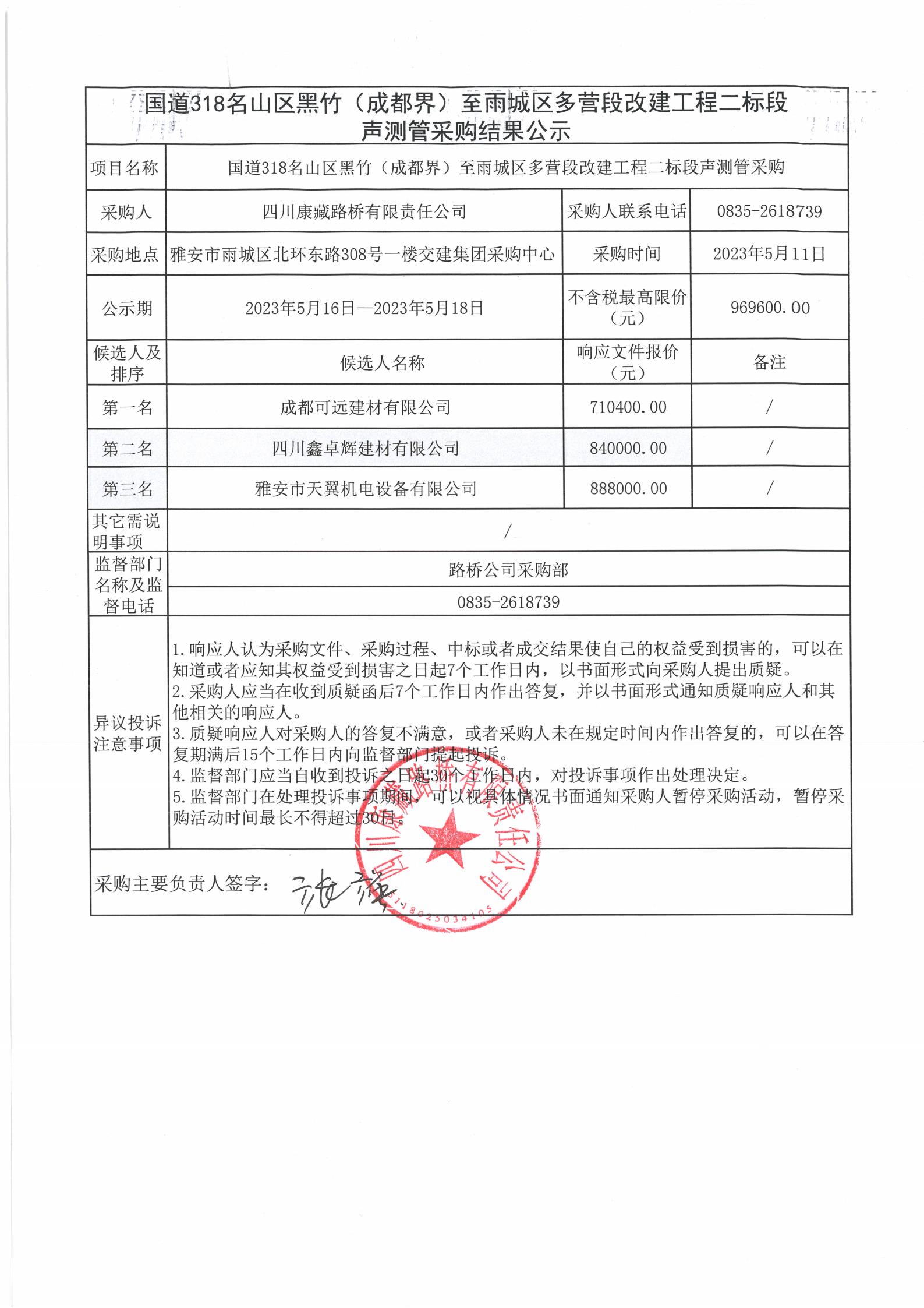 四川康藏路橋有限責(zé)任公司國道318名山區(qū)黑竹(成都界)至雨城區(qū)多營段改建工程二標段聲測管采購結(jié)果公示