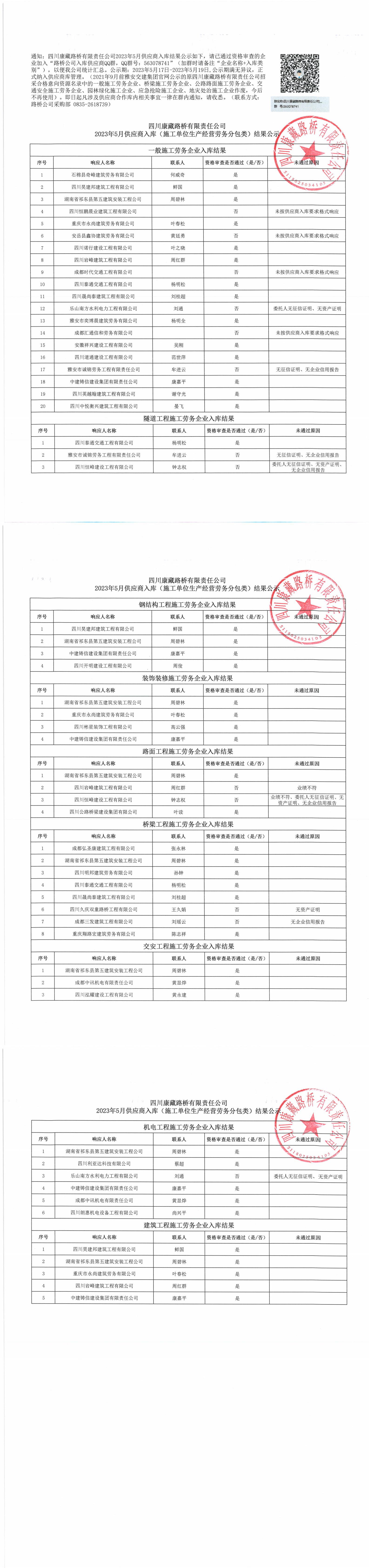 四川康藏路橋有限責(zé)任公司2023年5月供應(yīng)商入庫(kù)(施工單位生產(chǎn)經(jīng)營(yíng)勞務(wù)分包類)結(jié)果公示