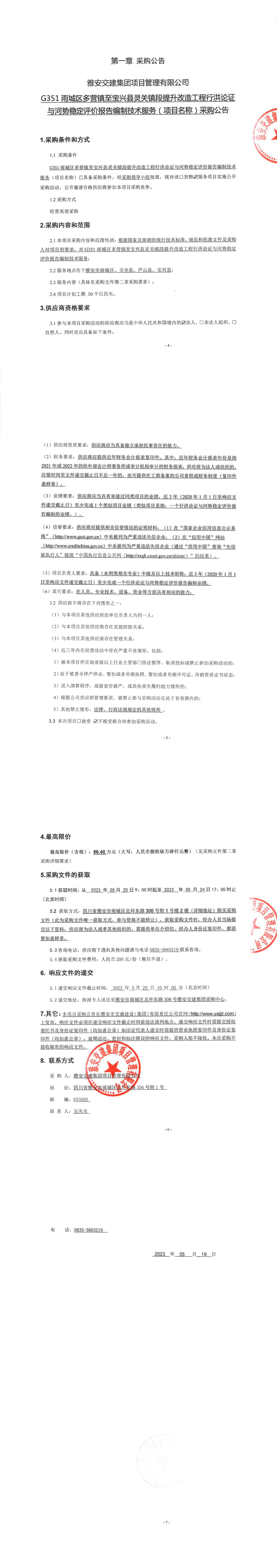 雅安交建集團項目管理有限公司G351雨城區(qū)多營鎮(zhèn)至寶興縣靈關鎮(zhèn)段提升改造工程行洪論證與河勢穩(wěn)定評價報告編制技術服務(項目名稱)采購公告