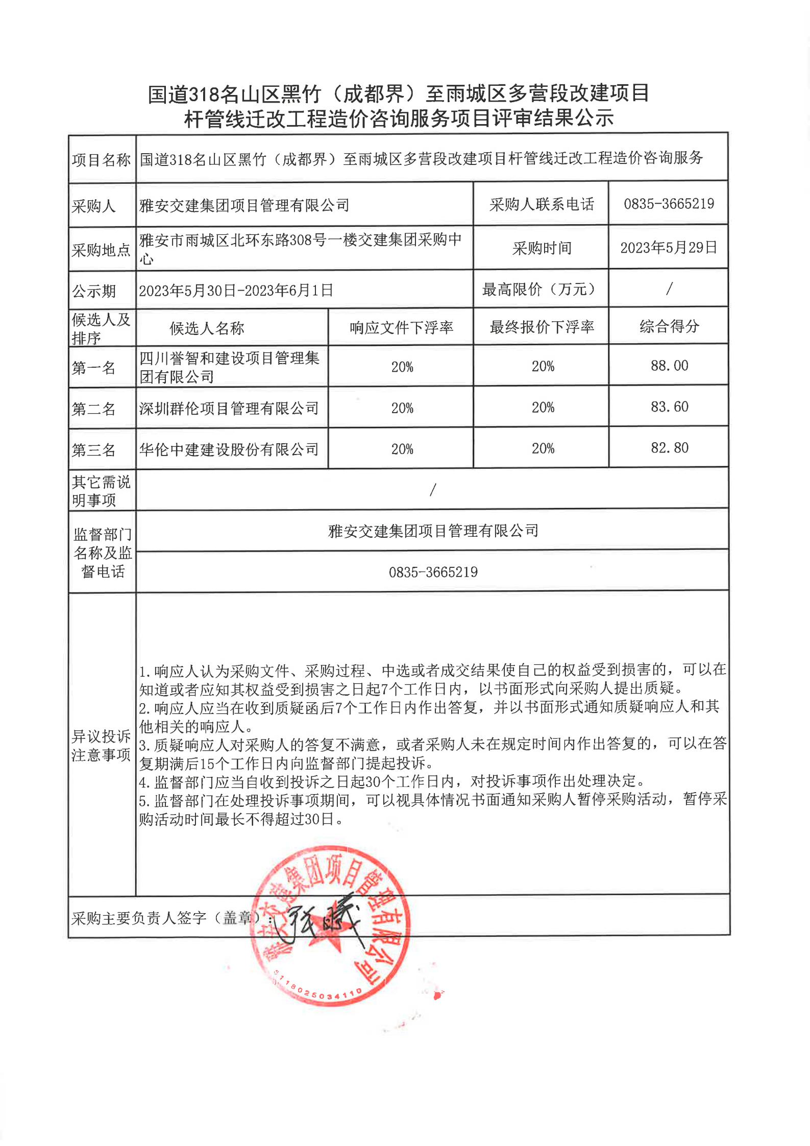 雅安交建集團項目管理有限公司國道318名山區(qū)黑竹(成都界)至雨城區(qū)多營段改建項目桿管線遷改工程造價咨詢服務項目評審結(jié)果公示
