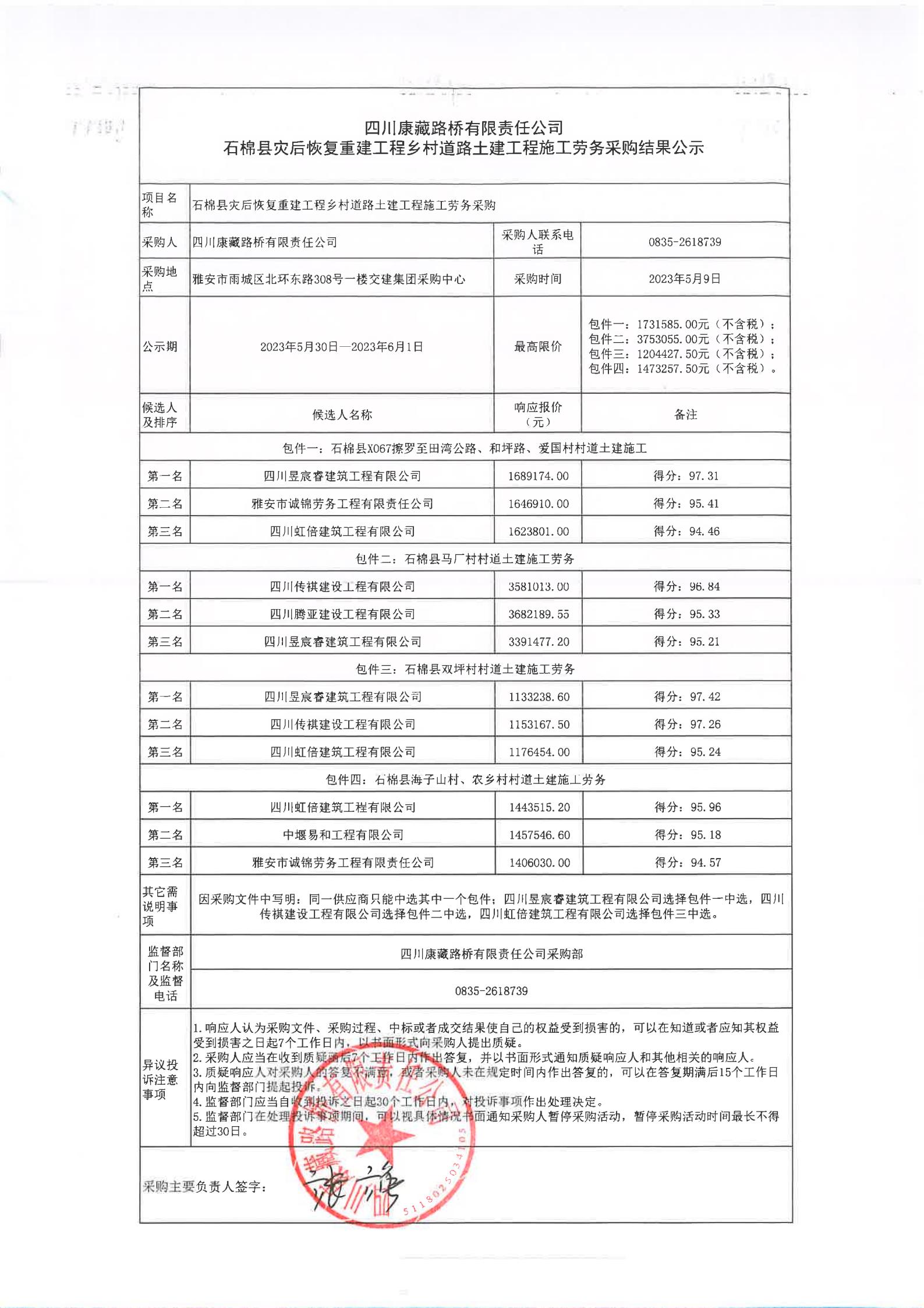 四川康藏路橋有限責(zé)任公司石棉縣災(zāi)后恢復(fù)重建工程鄉(xiāng)村道路土建工程施工勞務(wù)采購(gòu)結(jié)果公示