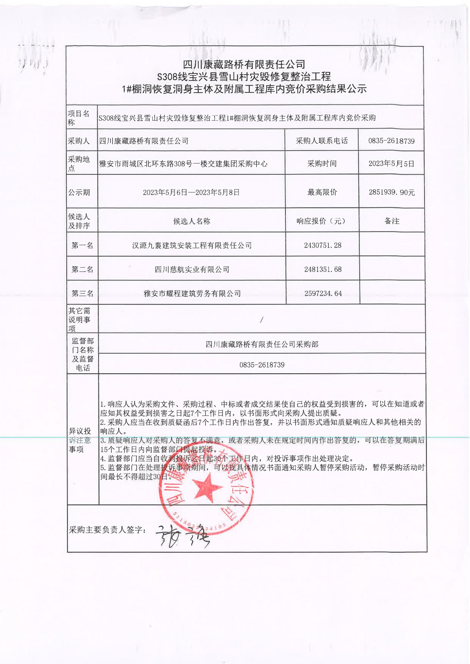 四川康藏路橋有限責(zé)任公司S308線寶興縣雪山村災(zāi)毀修復(fù)整治工程1#棚洞恢復(fù)洞身主體及附屬工程庫內(nèi)競價采購結(jié)果公示