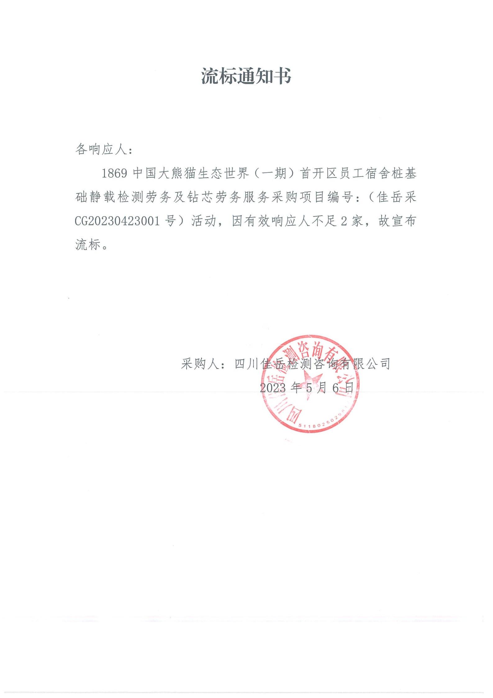四川佳岳檢測(cè)咨詢(xún)有限公司1869中國(guó)大熊貓生態(tài)世界(一期)首開(kāi)區(qū)員工宿舍樁基礎(chǔ)靜載檢測(cè)勞務(wù)及磚芯庫(kù)勞務(wù)服務(wù)流標(biāo)通知