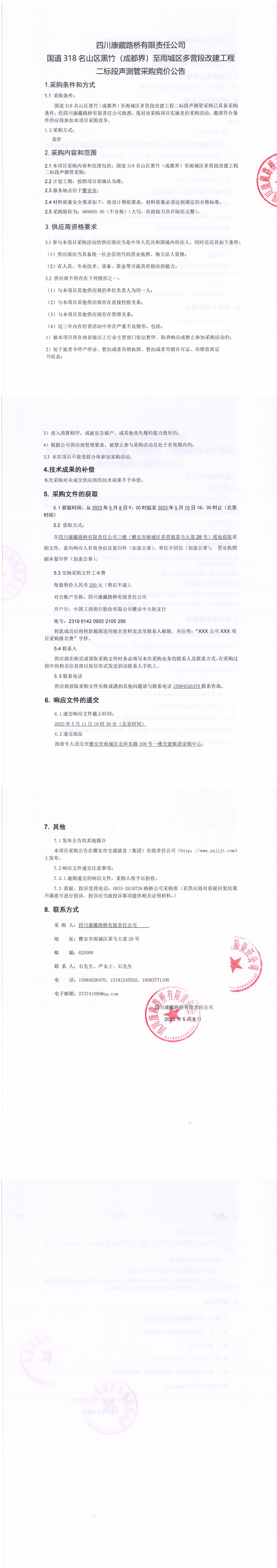 四川康藏路橋有限責任公司國道318名山區(qū)黑竹(成都界)至雨城區(qū)多營段改建工程二標段聲測管采購競價公告