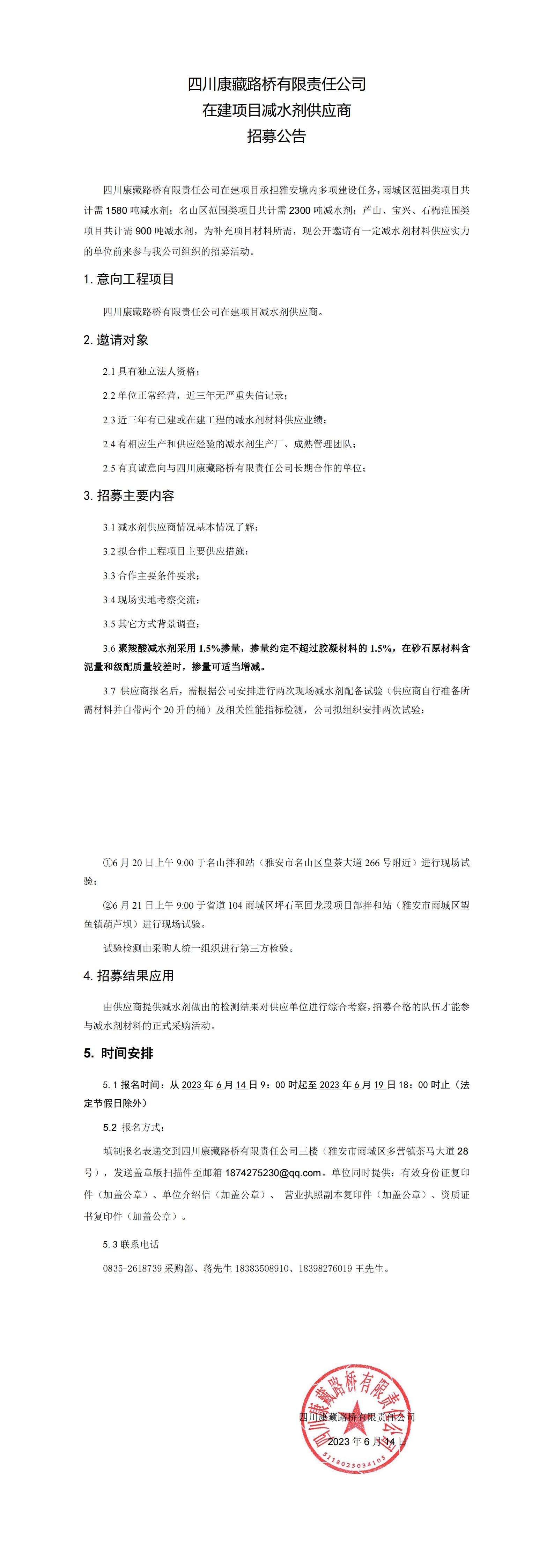 四川康藏路橋有限責(zé)任公司在建項目減水劑供應(yīng)商招募公告