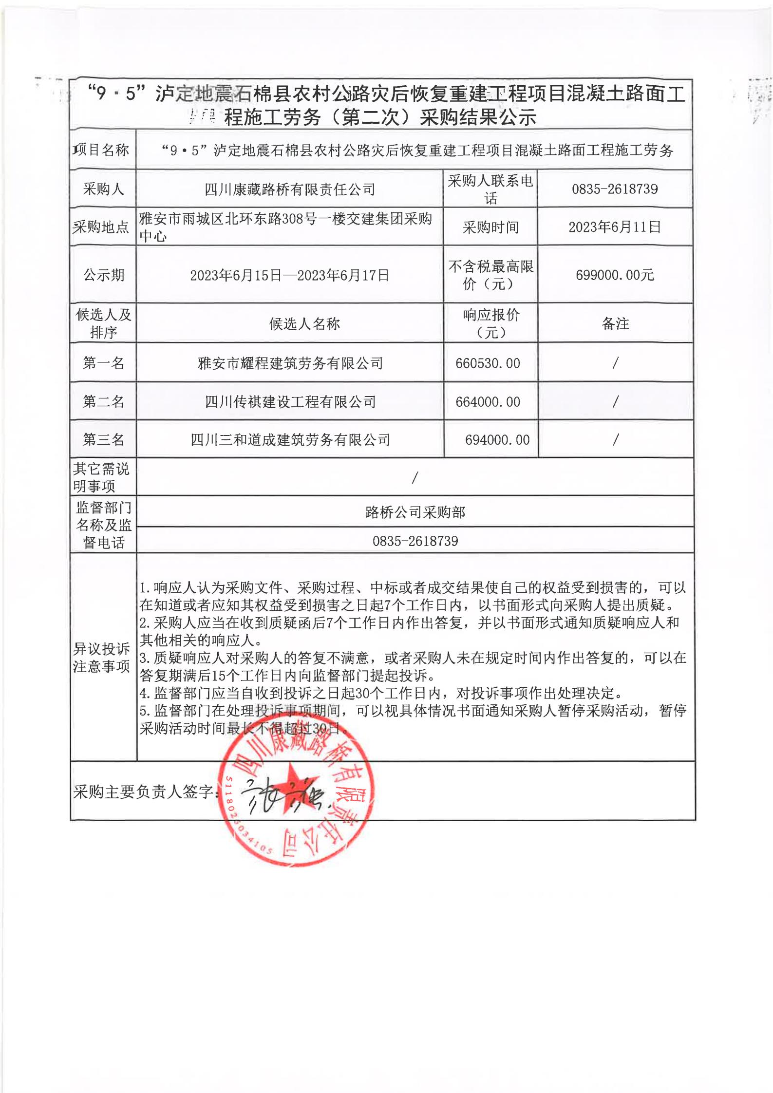 四川康藏路橋有限責(zé)任公司“9·5”瀘定地震石棉縣農(nóng)村公路災(zāi)后恢復(fù)重建工程項目瀝青路面工程施工勞務(wù)采購結(jié)果公示