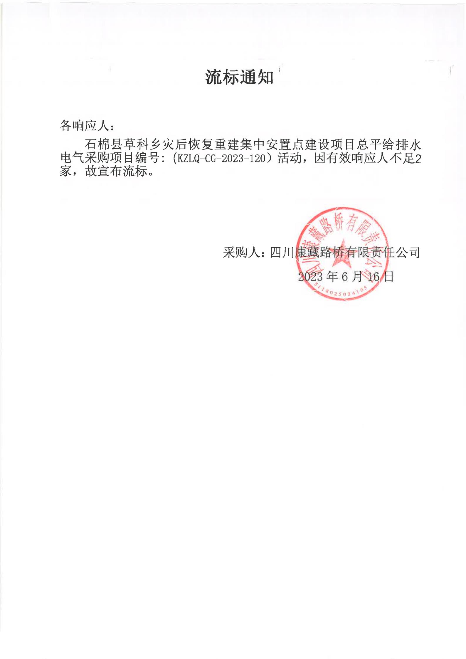 四川康藏路橋有限責(zé)任公司石棉縣草科鄉(xiāng)災(zāi)后恢復(fù)重建集中安置點(diǎn)建設(shè)項(xiàng)目總平給排水電氣采購流標(biāo)通知
