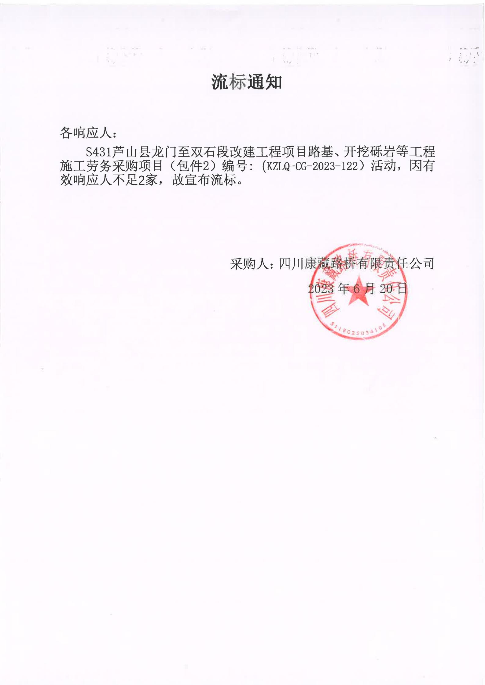 四川康藏路橋有限責(zé)任公司S431蘆山縣龍門至雙石段改建工程項(xiàng)目路基、開挖礫巖等工程施工勞務(wù)采購(包件2)流標(biāo)通知