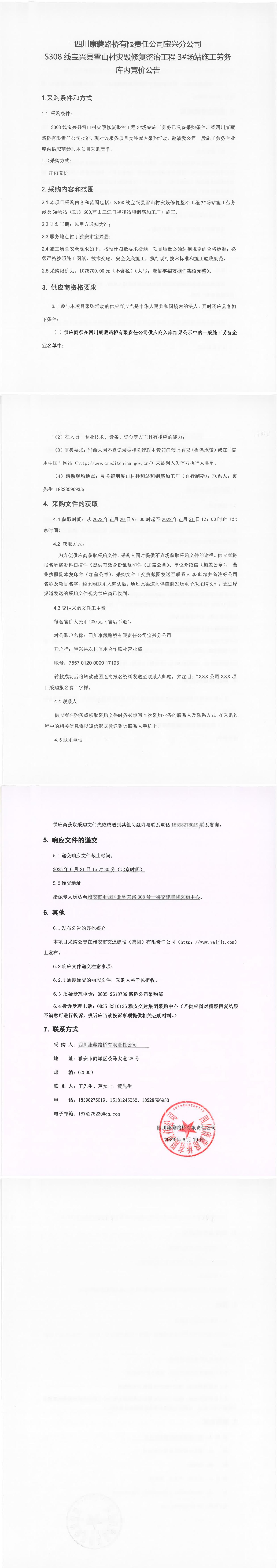 四川康藏路橋有限責(zé)任公司寶興分公司S308線寶興縣雪山村災(zāi)毀整治工程3#場(chǎng)站施工勞務(wù)庫(kù)內(nèi)競(jìng)價(jià)公告