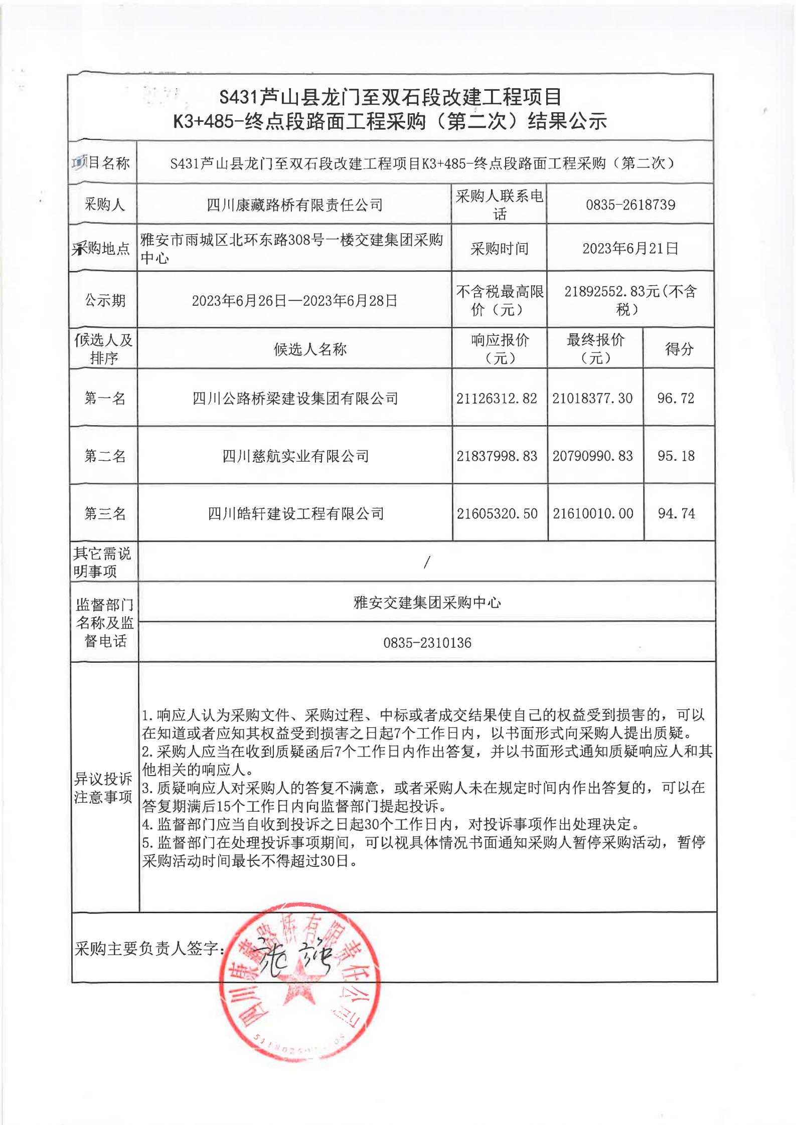 四川康藏路橋有限責(zé)任公司S431蘆山縣龍門(mén)至雙石段改建工程項(xiàng)目K3+485-終點(diǎn)段路面工程采購(gòu)(第二次)結(jié)果公示