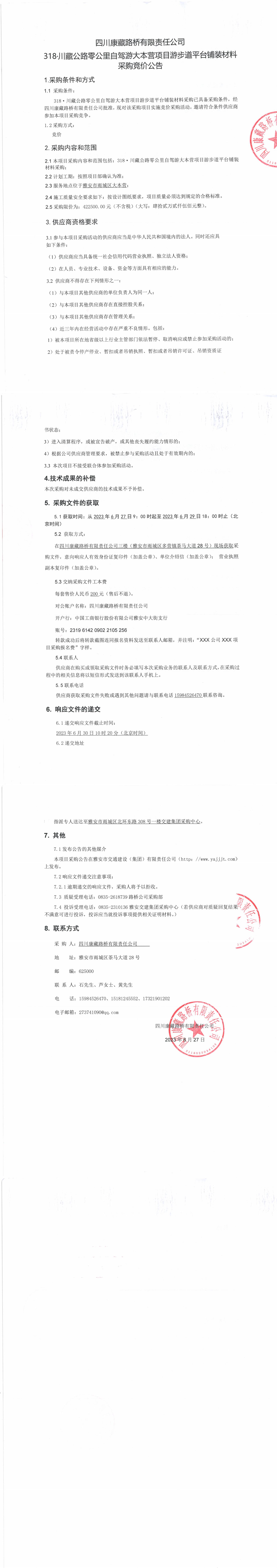 四川康藏路橋有限責(zé)任公司318·川藏公路零公里自駕游大本營項(xiàng)目步游道平臺(tái)鋪裝材料采購競價(jià)公告