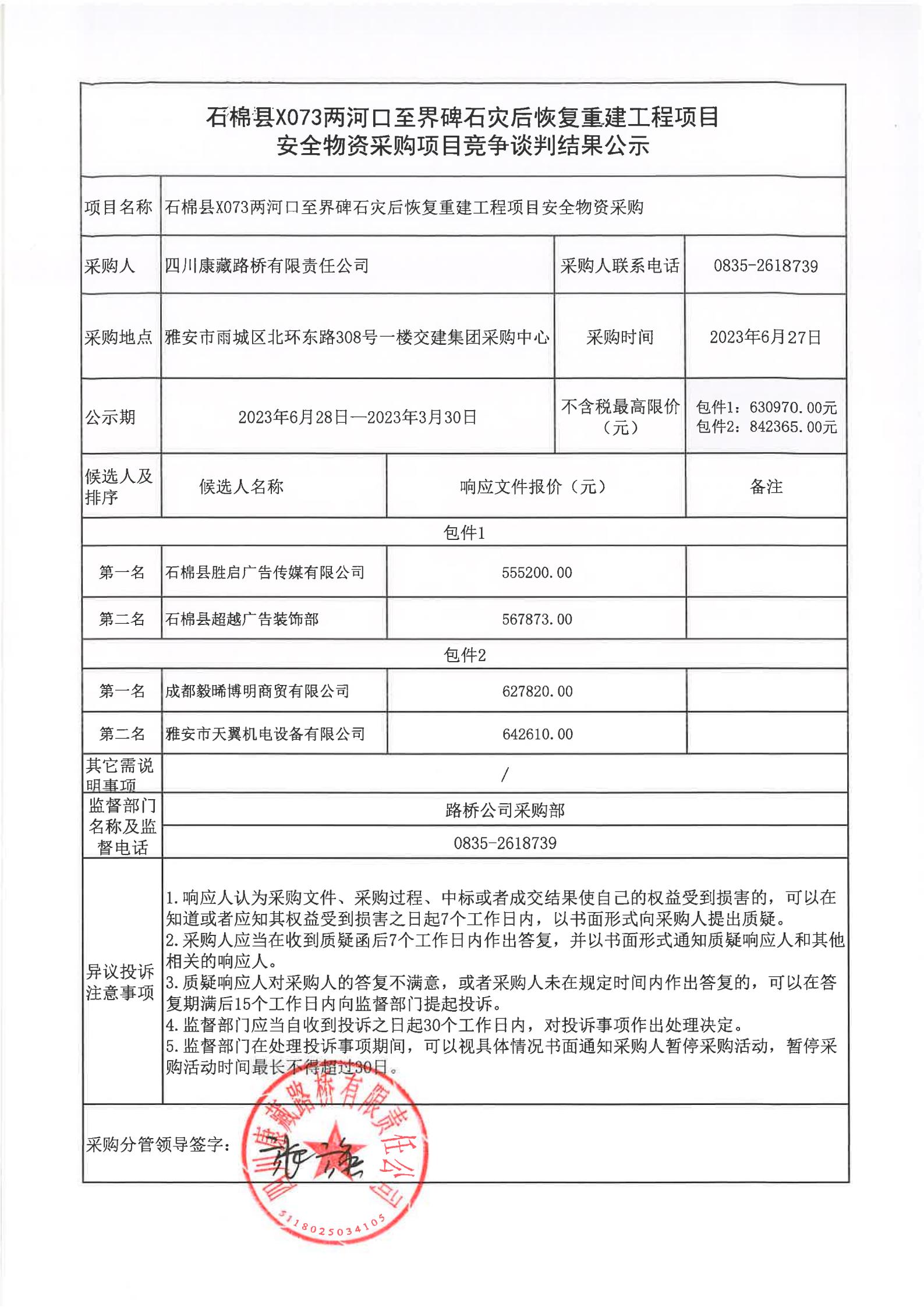 四川康藏路橋有限責任公司石棉縣X073兩河口至界碑石災(zāi)后恢復(fù)重建工程項目安全物資采購項目競爭談判結(jié)果公示