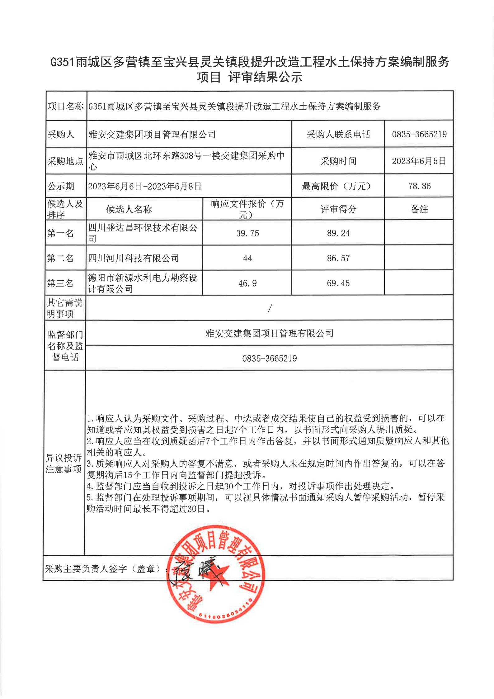 雅安交建集團(tuán)項目管理有限公司G351雨城區(qū)多營鎮(zhèn)至寶興縣靈關(guān)鎮(zhèn)段提升改造工程水土保持方案編制服務(wù)項目評審結(jié)果公示